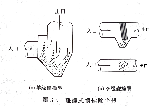• 利用粉塵與氣體在運動中的慣性力不同,使粉塵從氣流中分離出來。在實際應用中實現慣性分離的一般方法是使含塵氣流沖擊在擋板上,使氣流方向發生急劇改變,氣流中的塵粒慣性較